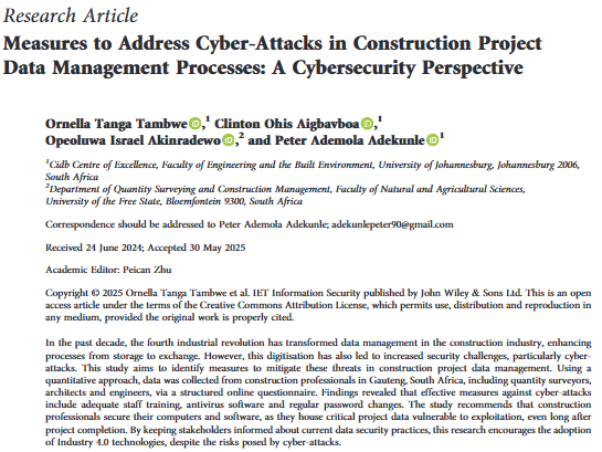 A recent study by Tambwe et al. (2025) titled “Measures to Address Cyber‐Attacks in Construction Project Data Management Processes: A Cybersecurity Perspective” published in IET Information Security reveals that the industry faces escalating risks from phishing, ransomware, SQL injection, malware, insider threats, data loss, and denial-of-service (DDoS) attacks.